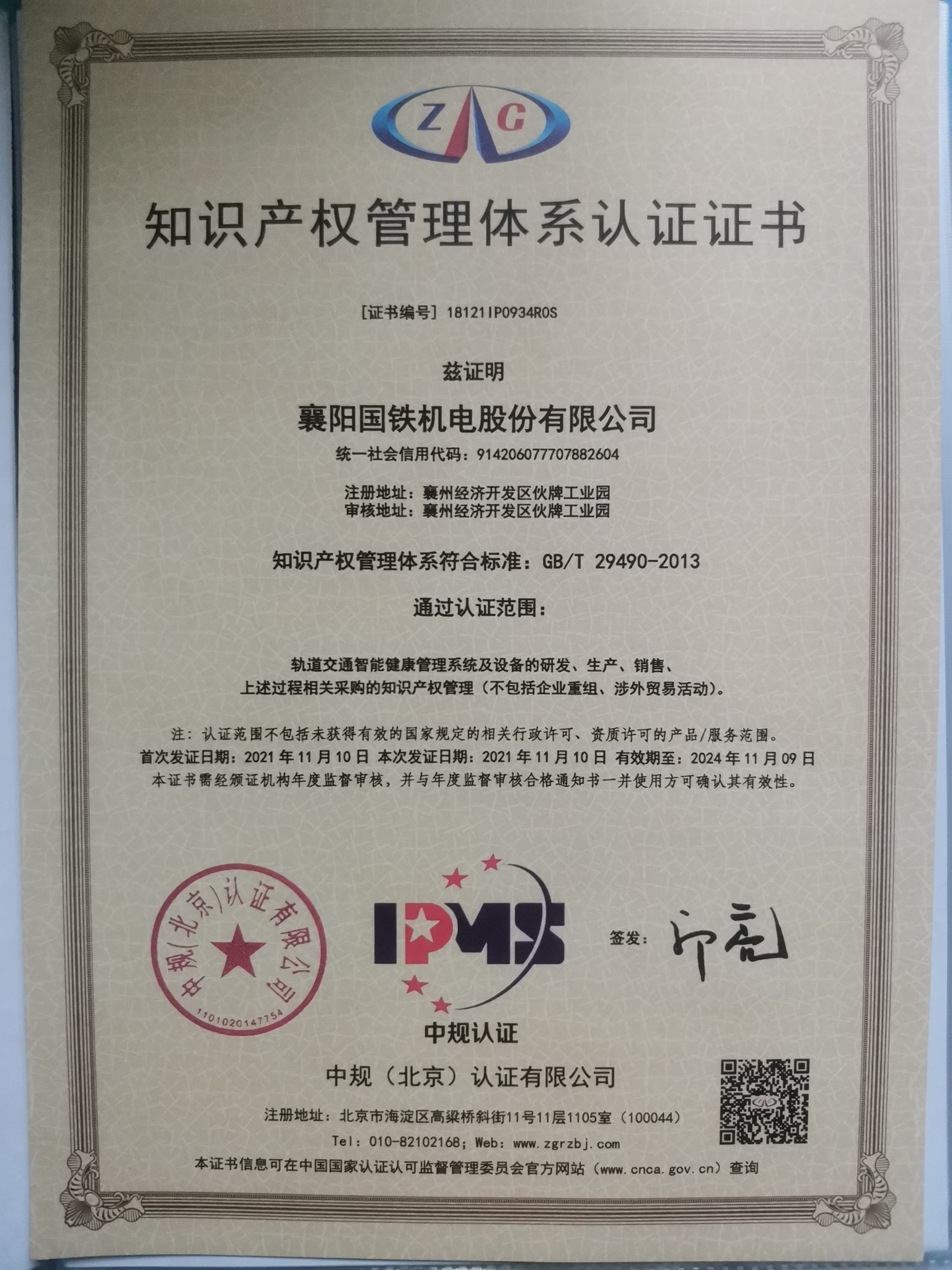 知識產(chǎn)權管理體系認證證書