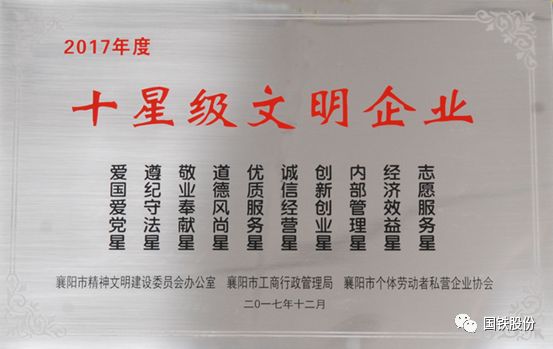 近日,襄陽國鐵榮獲由襄陽市精神文明建設(shè)委員會辦公室、襄陽市工商行政管理局、襄陽市個體勞動者私營企業(yè)協(xié)會聯(lián)合頒發(fā)的“2017年度十星級文明企業(yè)”榮譽(yù)稱號。