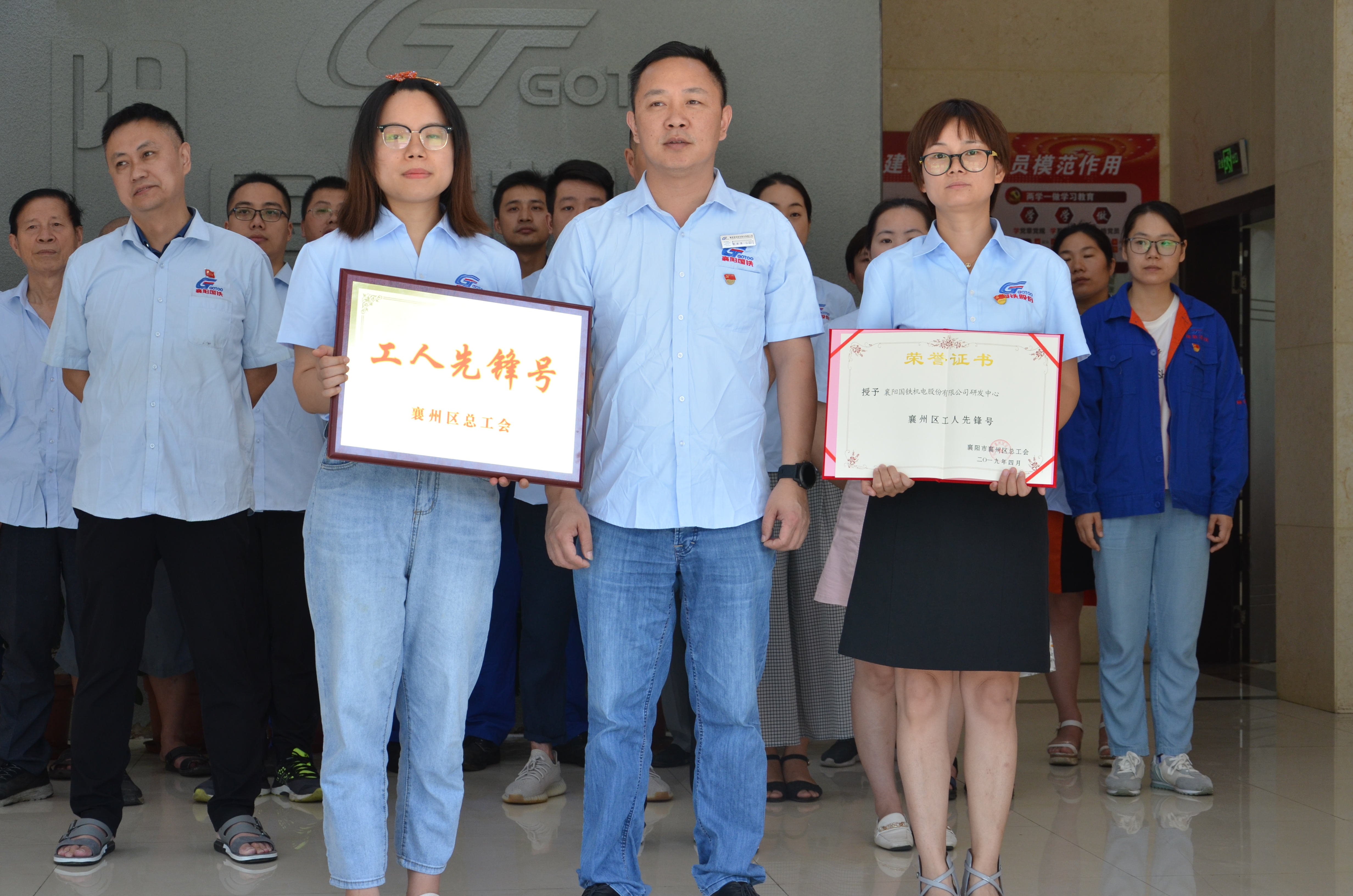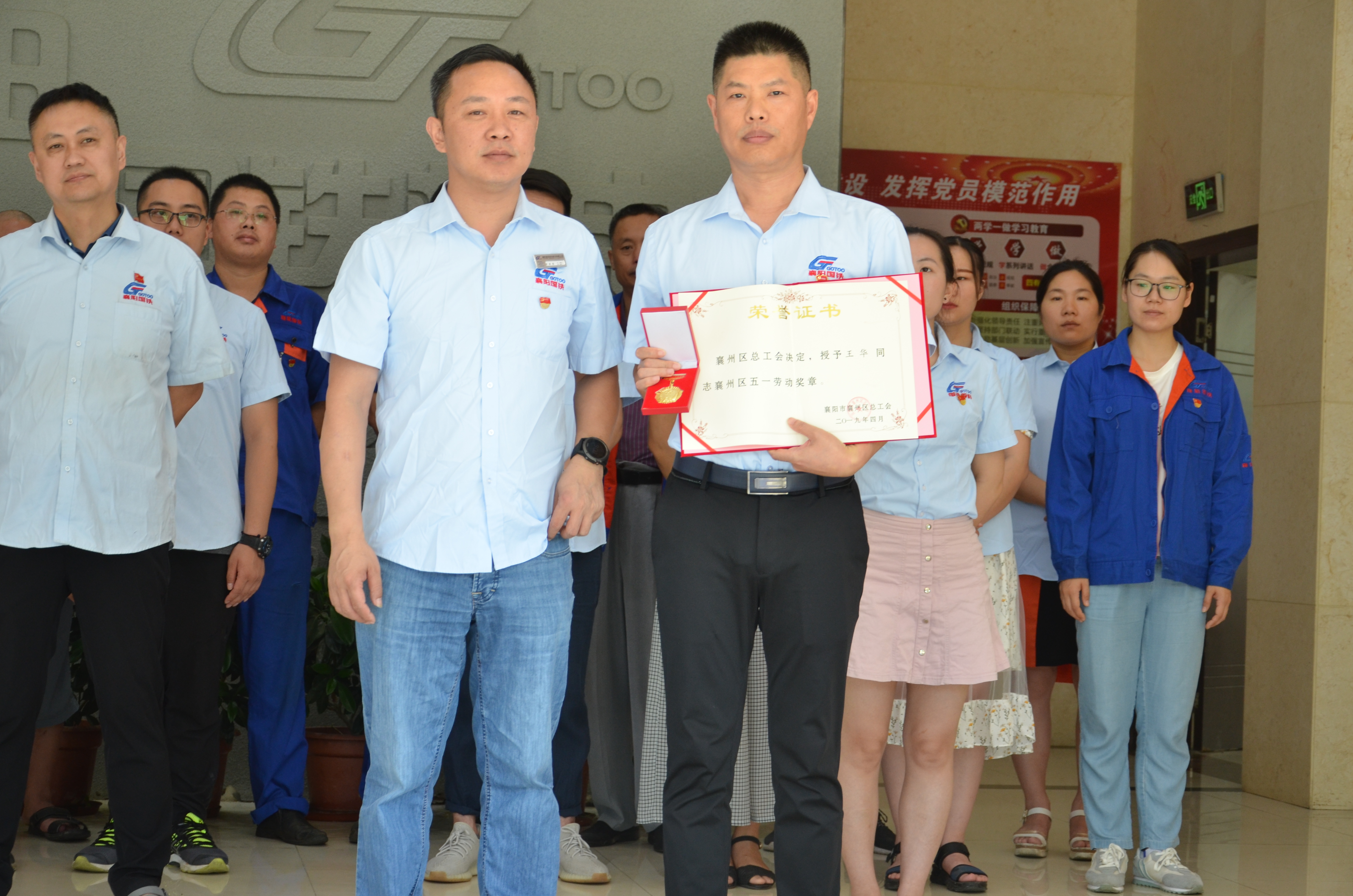 襄州區(qū)總工會(huì)決定,授予“王華同志襄州區(qū)五一勞動(dòng)獎(jiǎng)?wù)隆?;授予“襄陽國鐵機(jī)電股份有限公司研發(fā)中心襄陽工人先鋒號(hào)”獎(jiǎng)?wù)隆S牲h支部書記代表代表襄州區(qū)總工會(huì)授予獲獎(jiǎng)部門獎(jiǎng)?wù)?、證書、獎(jiǎng)牌。